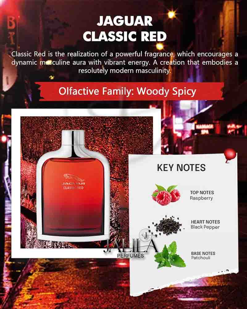 JAGUAR CLASSIC RED FOR MEN EDT 100 ML BD8.100 BD18.000 55%OFF Jaguar Classic Red is a Woody Aromatic fragrance for men. Jaguar Classic Red was launched in 2013. The nose behind this fragrance is Karine Dubreuil-Sereni. Top notes:- Raspberry, Blueberry and Bergamot. Middle notesl:- Black Pepper, Jasmine and Ozonic notes. Base notes:- Tonka Bean, Vanilla, Amber, Cedar and Patchouli. Add to cart PRODUCT DESCRIPTION main accords fruity, sweet, vanilla, amber, woody, fresh spicy, warm spicy, aromatic, powdery, citrus. Top Notes Raspberry Blueberry Bergamot Middle Notes Black Pepper Jasmine Ozonic notes Base Notes Tonka Bean Vanilla Amber Cedar Patchouli JAGUAR CLASSIC RED, JAGUAR CLASSIC RED MEN, JAGUAR