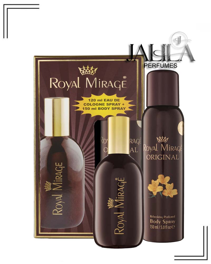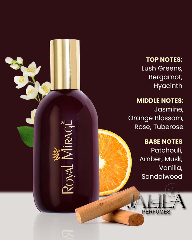 1- EDC 120 ml. 2- Body Spray 150 ml. Royal Mirage Brown is a classic floral and woody fragrance for men and women. Royal Mirage was launched in 1980. Top Notes:- Lush Greens, Bergamot, Hyacinth. Middle Notes:- Jasmine, Orange Blossom, Rose, Tuberose. Base Notes:- Patchouli, Amber, Musk, Vanilla, Sandalwood.
