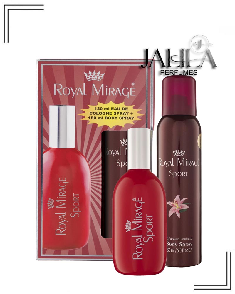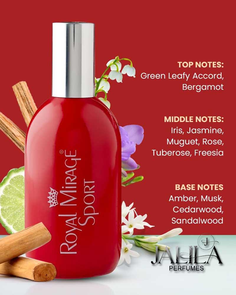 1- EDC 120 ml. 2- Body Spray 150 ml. Royal Mirage Sport is a oriental fragrance for men and women. Top Notes:- Green Leafy Accord, Bergamot. Middle Notes:- Iris, Jasmine, Muguet, Rose, Tuberose, Freesia. Base Notes:- Amber, Musk, Cedarwood, Sandalwood.